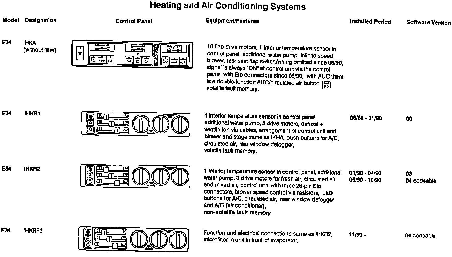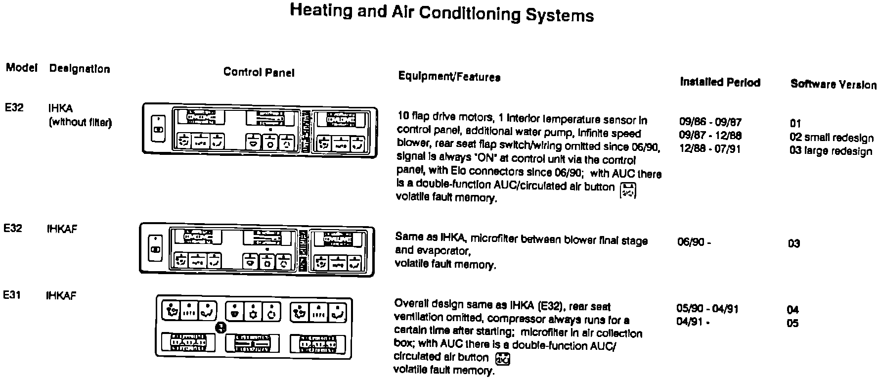 Attached is a survey (up to 9/91 production) of all U.S. variants of IHKA and IHKR Heating/Air Conditioning Systems as found on E31, E32, and E34 vehicles. Each system is identified by designation, software version, and the production period in which it was installed. An illustration of the control panel and a description of equipment and features accompanies each designation.