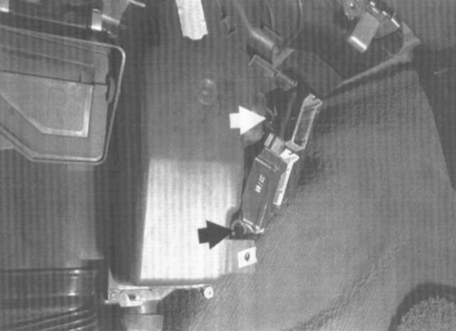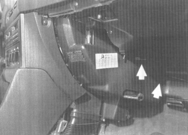 3. Remove trim cover at left side of glove box by removing retaining clip and screws (arrows).