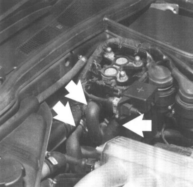 - Disconnect coolant hoses from heater valve (arrows).