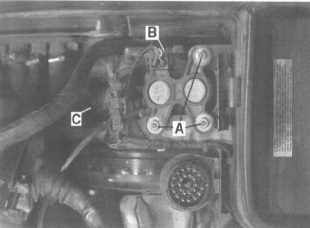 - Disconnect harness connector (B) and coolant hose (C). Remove mounting nuts (A) from heater valve. Lift out heater valve together with auxiliary coolant pump.