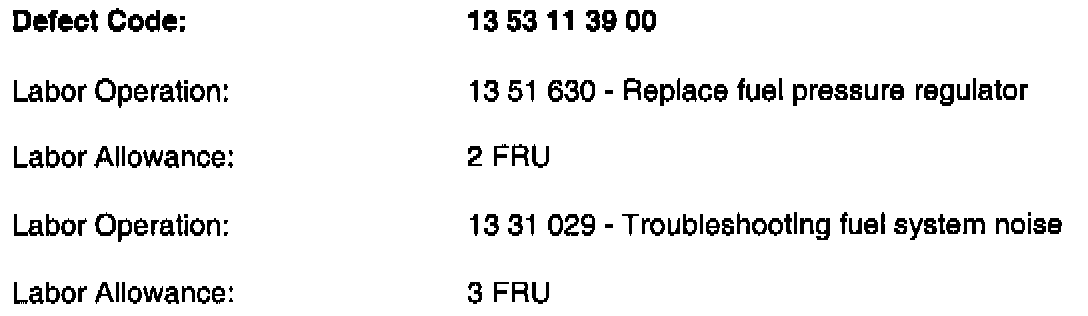 In case of a customer complaint if a noise is heard as described above, the Pierburg fuel pressure regulator should be replaced with a Bosch regulator.