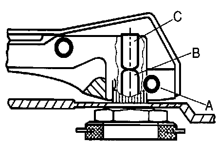 Schematic of wiper arm on cars with ADV. After installing arm, tighten clamping screw (A), then tighten adjusting screw (C) until screw contacts ADV pin (B).
