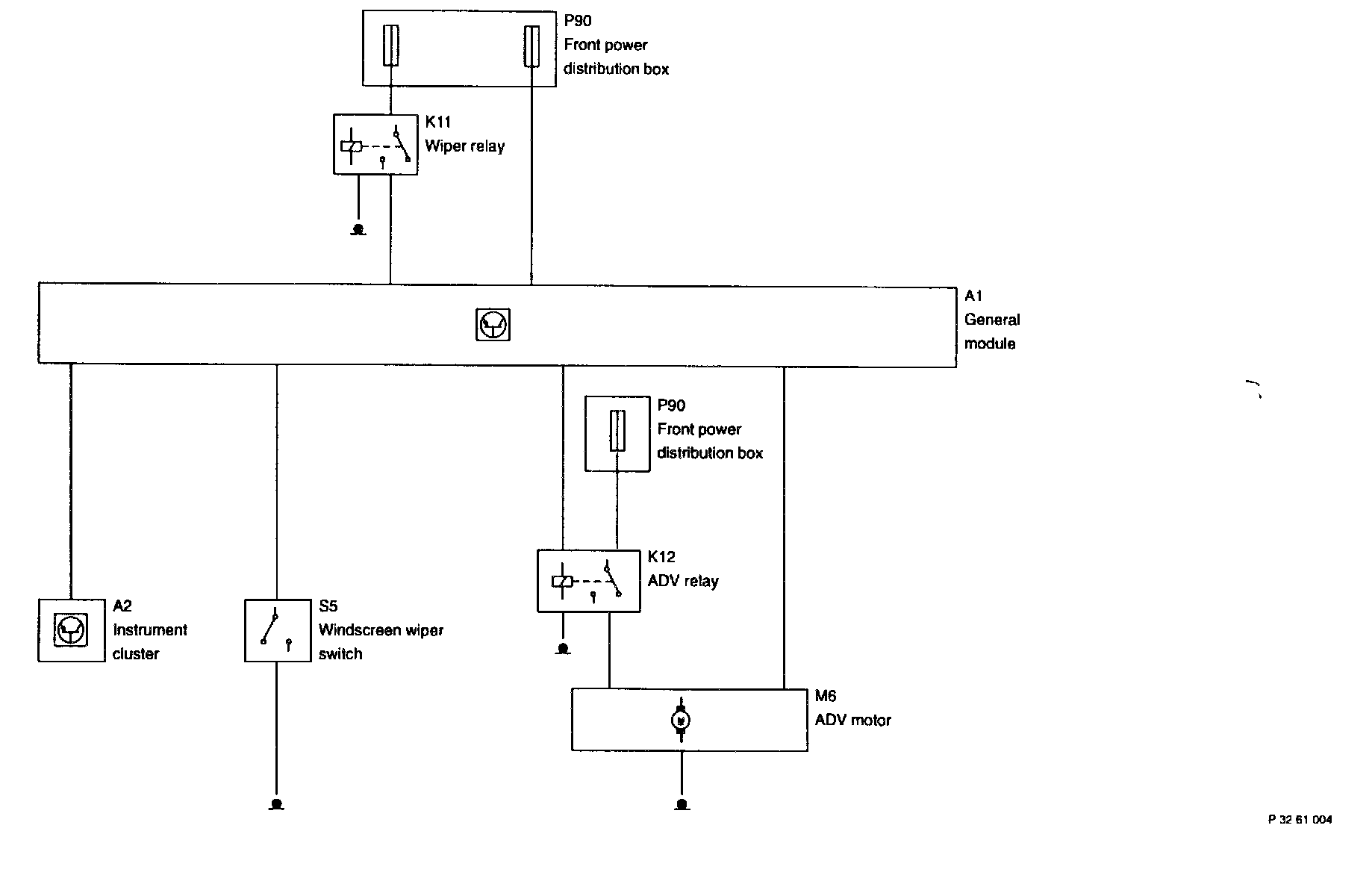 The windscreen wiper pressure control system (ADV) is controlled by the general module (GM) of the central body electronics (ZKE). The relays are located in the ADV module. Installation location: Rear power distribution box.