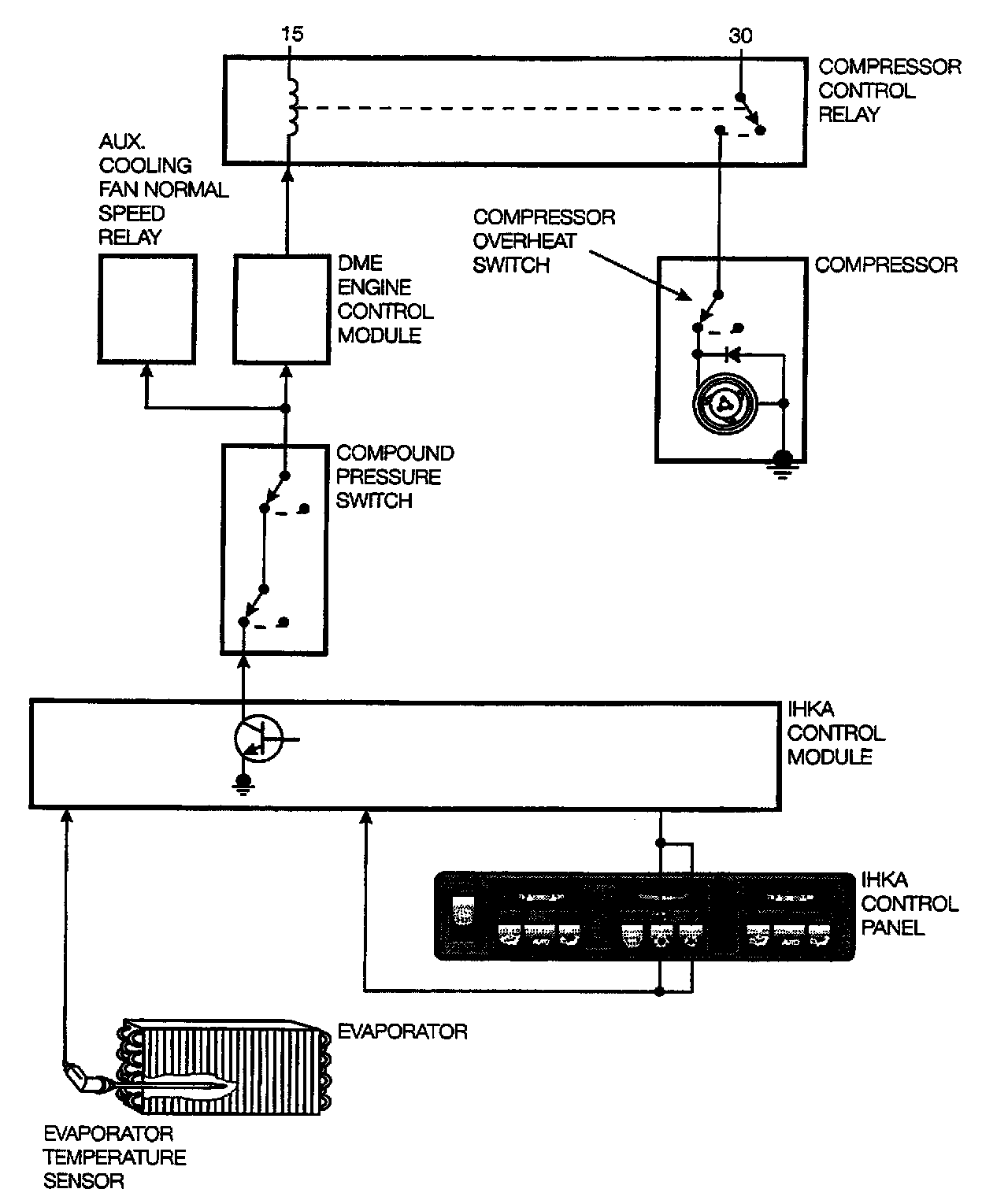- If evaporator temperature falls too low, the IHKA control module stops sending the A/C compressor request to the ECM and the ECM de-energizes the compressor control relay.