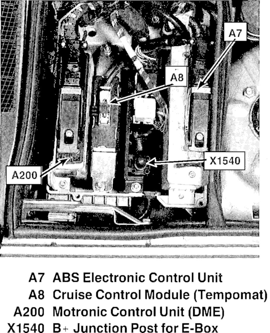 The DME control unit is located in the E-Box at the right rear of the engine compartment.