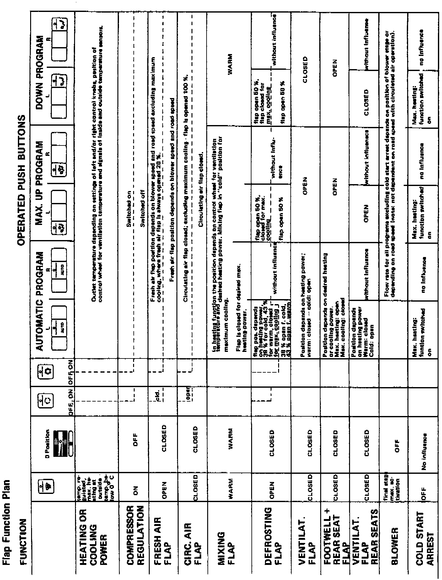 When pressing the air conditioner button the [1][2]auxiliary fan is turned on to its low speed. High speed of the fan is switched on if coolant temperature exceeds 210°F or if refrigerant pressure exceeds 17 bar (250 psi). A 10 second delay is provided so the high speed of the fan is not turned "on" when the compressor is disengaged.