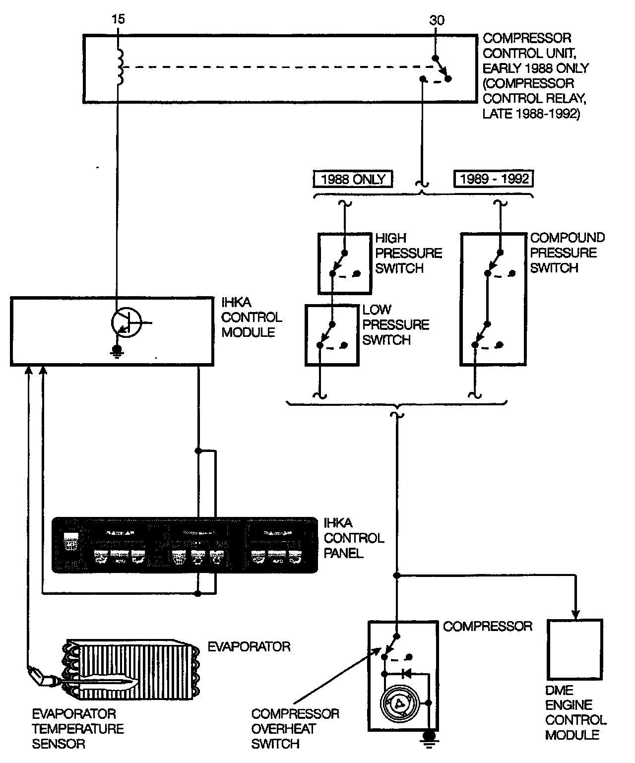 Compressor control on six cylinder E32 vehicles is handled by the IHKA control module as follows: