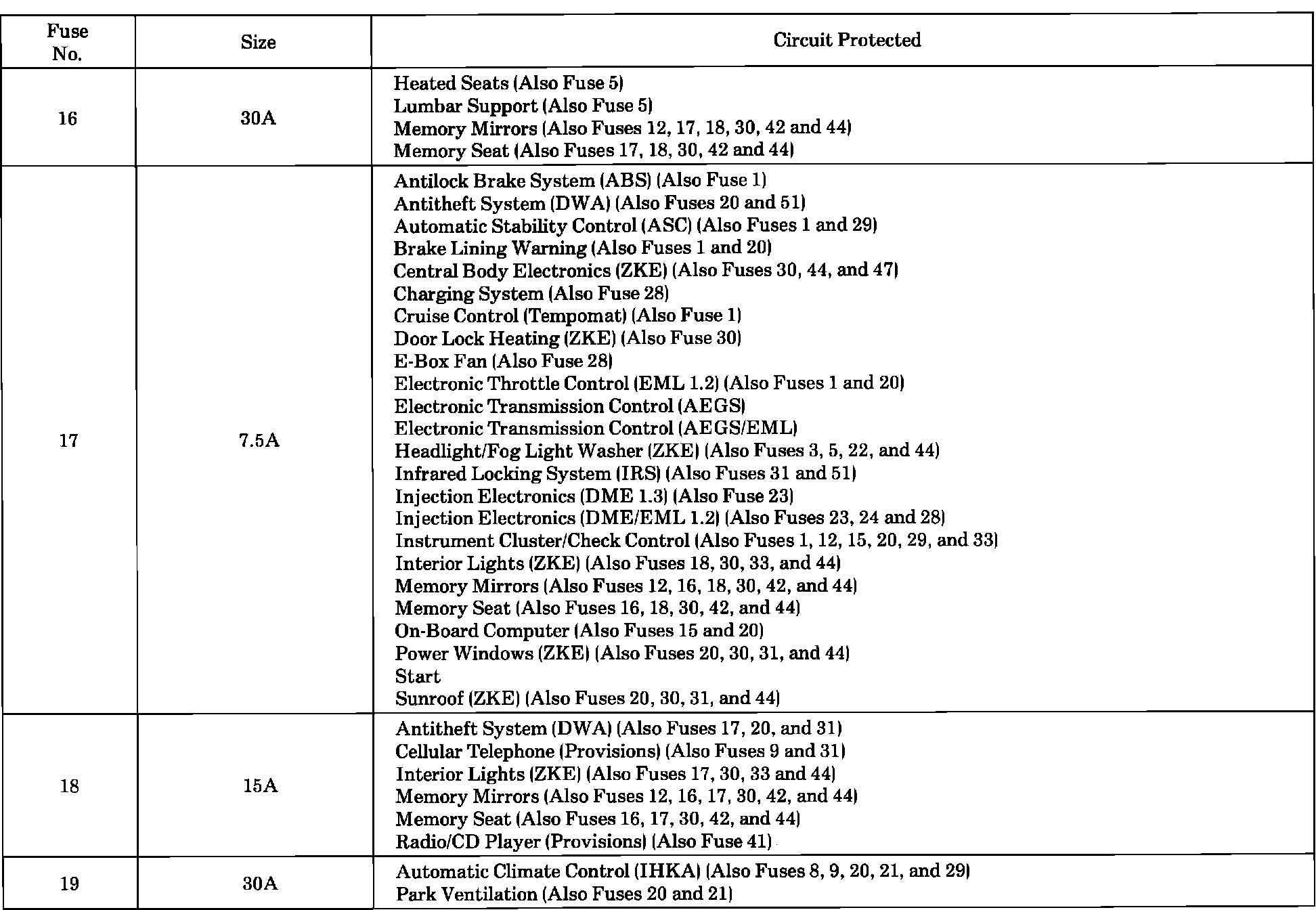 Fuse Assignments: 16 To 19: