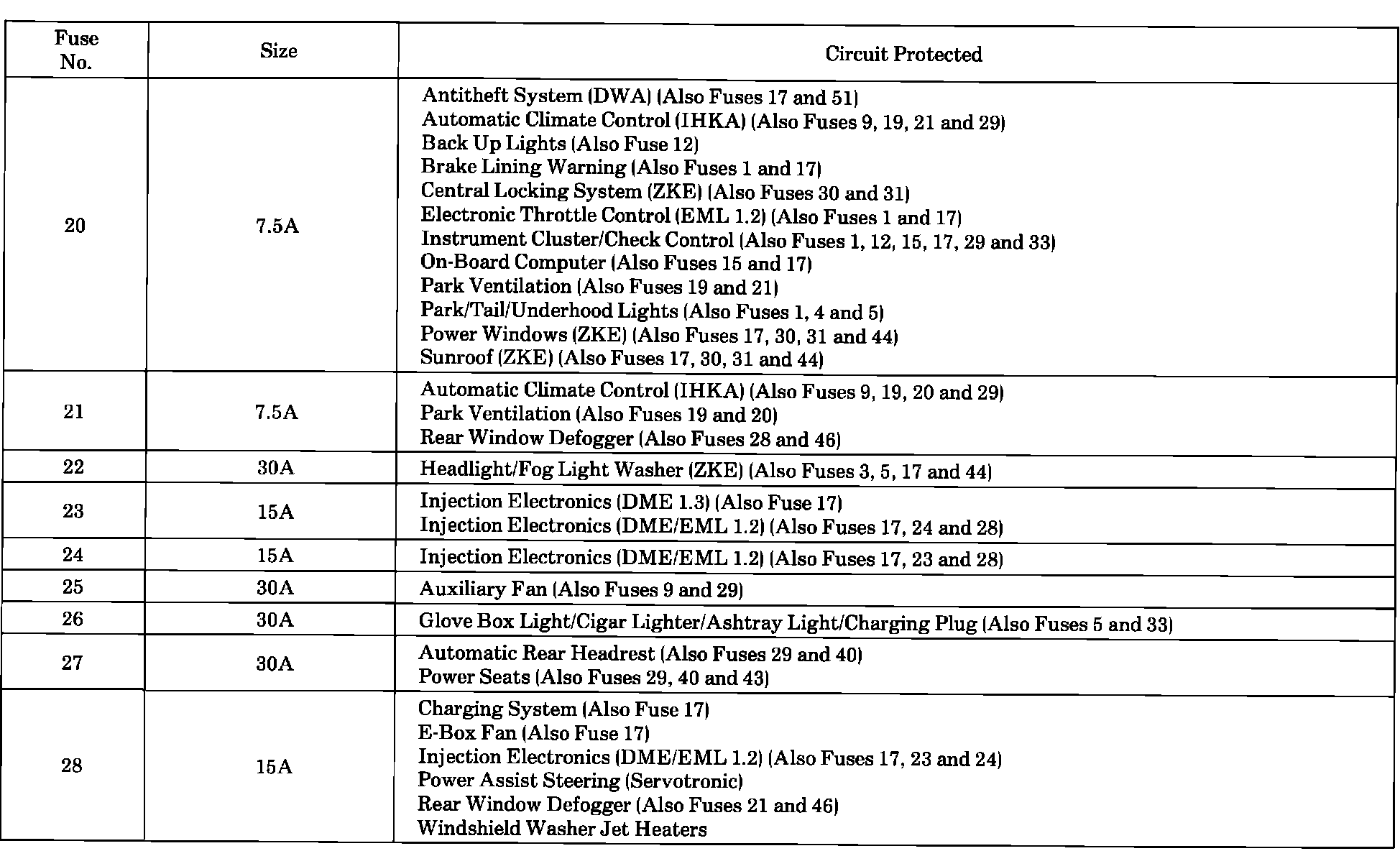 Fuse Assignments: 20 To 28: