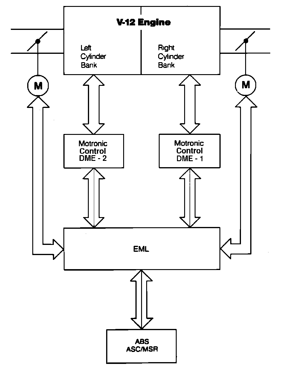 NOTE: The BMW V12 engine uses two complete independent (DME) Motronic engine control systems. DME control unit 1 for cylinders 1-6, and DME control unit 2 cylinders 7-12.