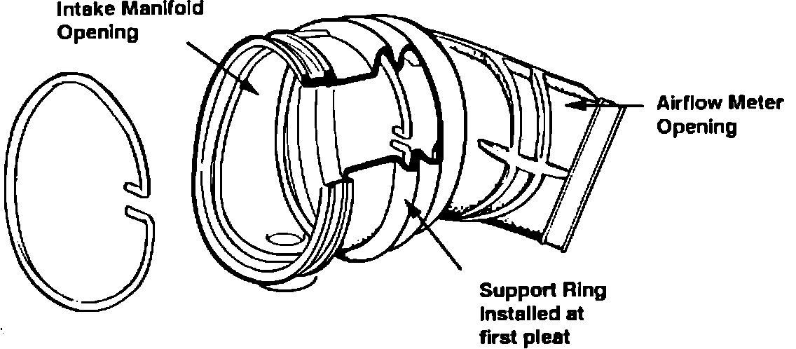 2) Install support ring from intake manifold end of boot so that it lies fully within the first pleat. The ring is properly positioned by noting that the ring's inwardly bent ends point to the right of the boot.