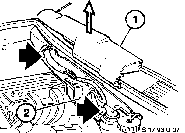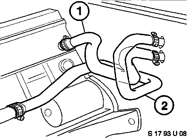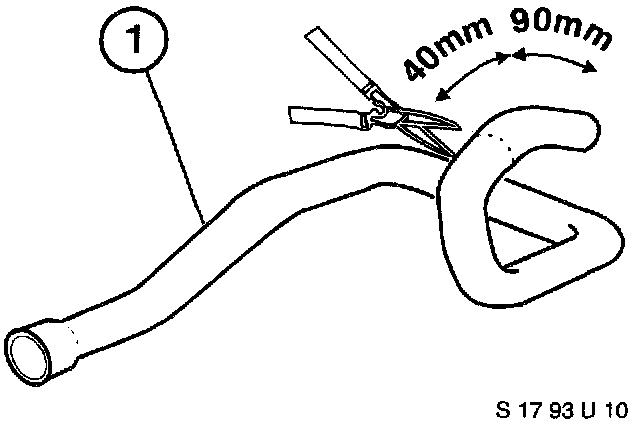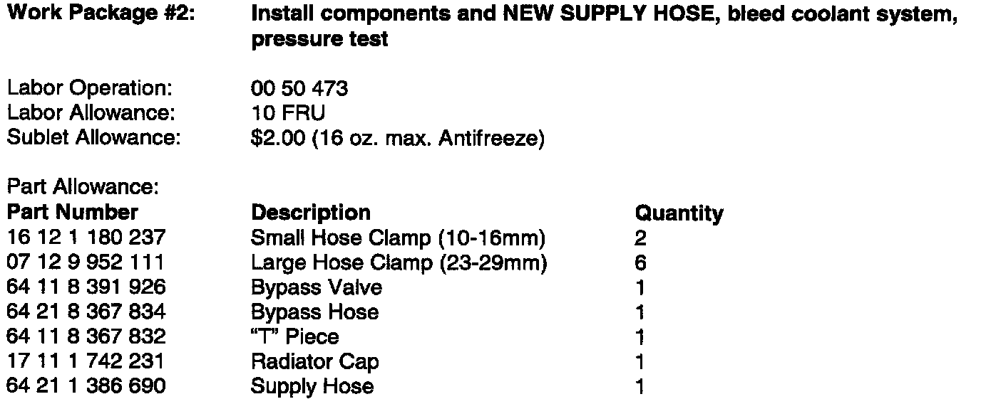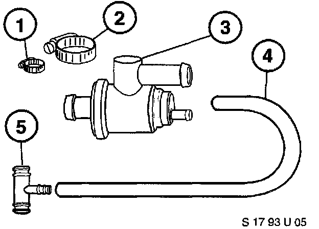 The required parts to assemble the bypass are shown below. Assemble the bypass valve (item # 3) into the cut supply hose. The illustration # 5 17 93 U 11 shows the proper orientation of the components when installed in the vehicle. Note that an arrow on the body of the bypass valve shows the direction of coolant flow, from the cylinder head to the heater core. Do not install the valve backwards. Secure the supply hose to the bypass valve with two of the larger hose clamps (item # 2). Attach the curved end of the bypass hose (item # 4) to the small nipple on the bypass valve and secure with a small hose clamp (item # 1). Large hose clamps are to be torqued to 2.5 Nm, small hose clamps to 1.5 Nm, using a torque wrench.