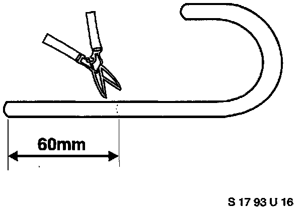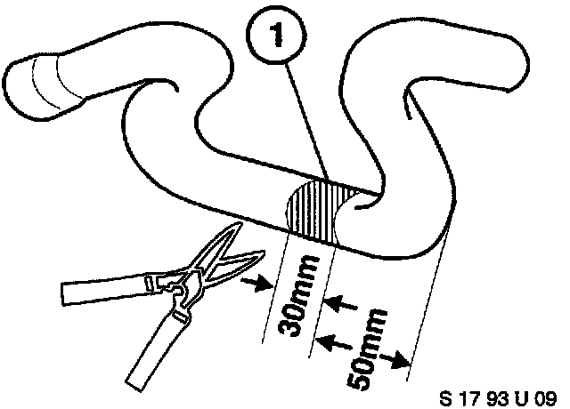 Carefully remove a 30 mm section of the supply hose measuring from the lower bend at the firewall end, using tin snips, hose cutters, or a sharp knife. This must be done with the hose installed in the vehicle. Refer to the illustration for location of cuts.