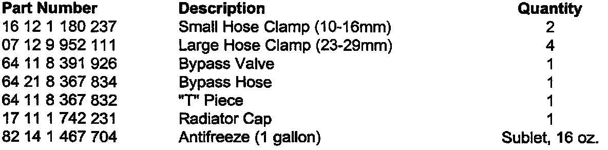 Replace the radiator cap with a new version to control system pressure and provide greater coolant overflow in the event of overheating. Install thermostatic bypass valve and associated installation hardware to control coolant temperature in the heater core.