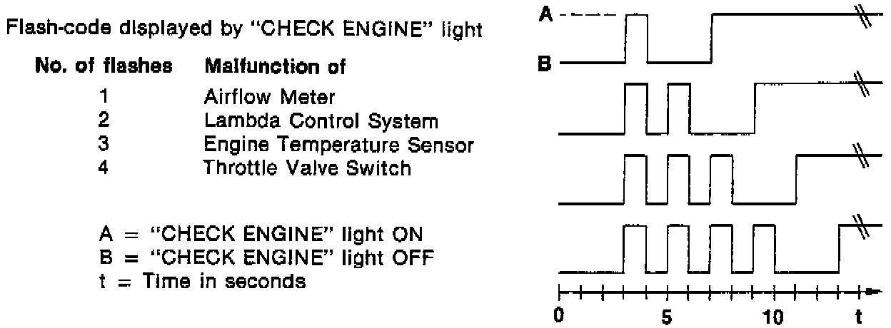 If, for example, the engine temperature sensor and the airflow meter should have failed in this sequence, you will read after 3 seconds the 3-flash code, after another 3 seconds the 1-flash code, then after another 3 seconds the "CHECK ENGINE" light will be on continuously.