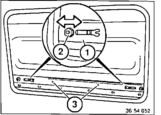 Move left/right adjustment wedges (1) in or out so far until the ideal position is reached. Push sun roof lid forward and tighten nuts (2). Install and tighten screws (3). Tightening torque = 4.5 N-m.