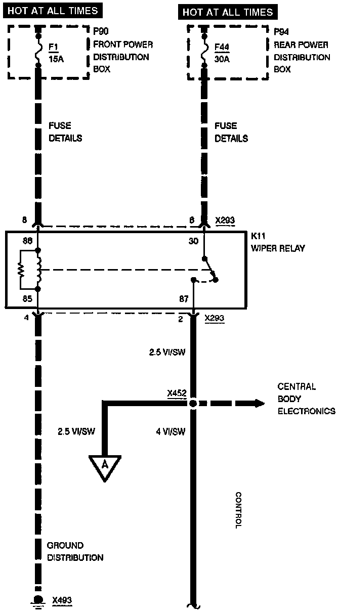 7. The dashed line from pin 4 of connector X293 to ground X493 shows the ground supply for relay K11. If required, refer to Ground Distribution at ground X493 for the complete line progression with all plug connections, line branches, wire colors and cross sections.