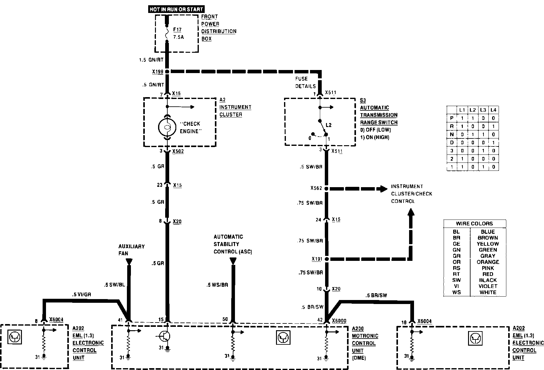 ^ Brown/black wire (terminal 3) of range selector switch to terminal 42 of the DME control unit = 0 Ohms. If not, check for an open.