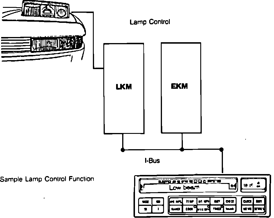 The LKM monitors lamps, fuses, and related switch circuits. It also controls the light relays, and transfers data concerning lamp operation to the EKM (via the I-Bus).