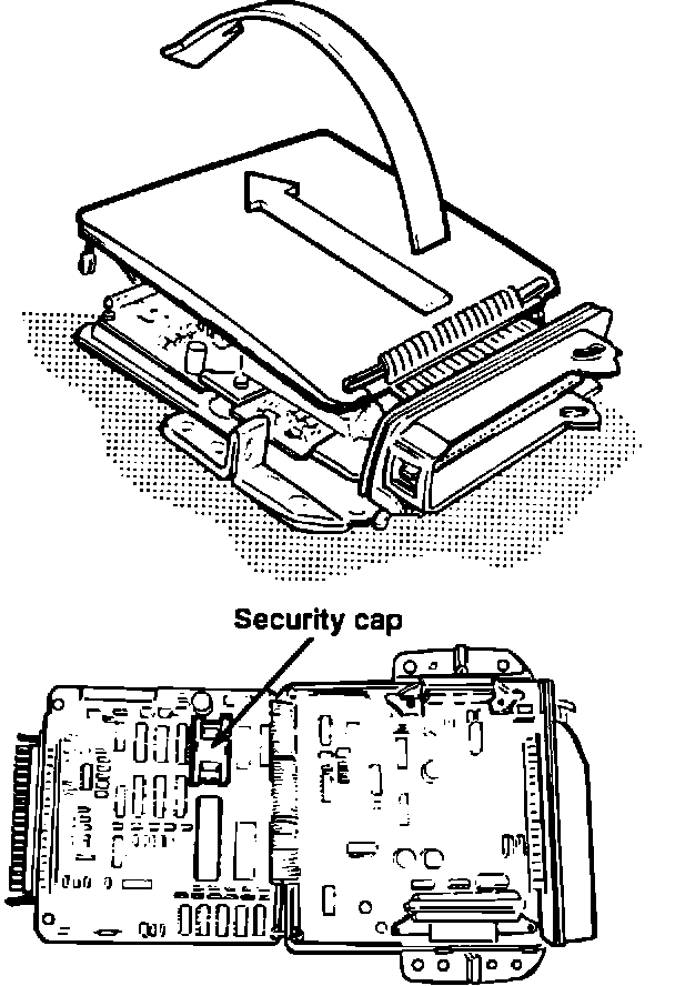 - With the upper circuit board removed, remove the EPROM security cap by inserting a small straight blade screwdriver into the slot on each long side and releasing the catch by gently prying outward against the side.