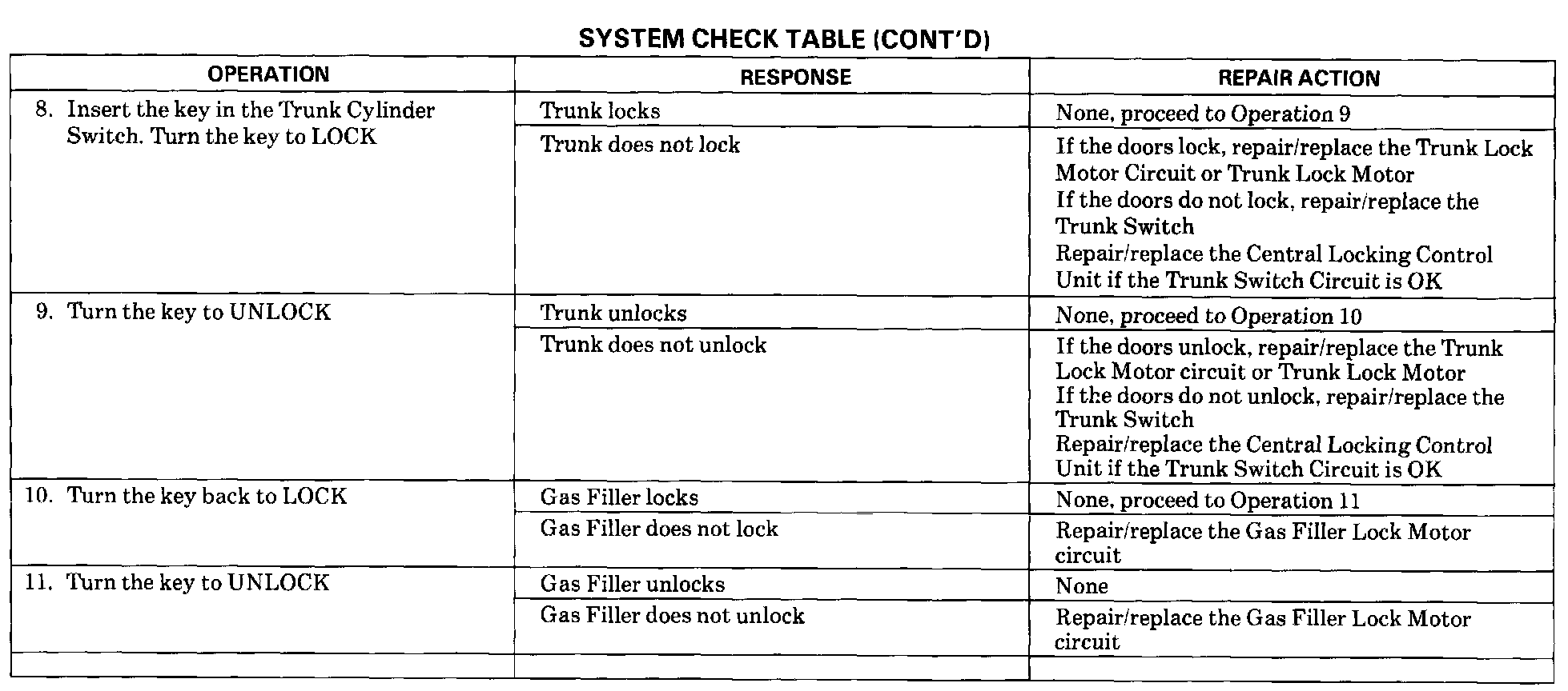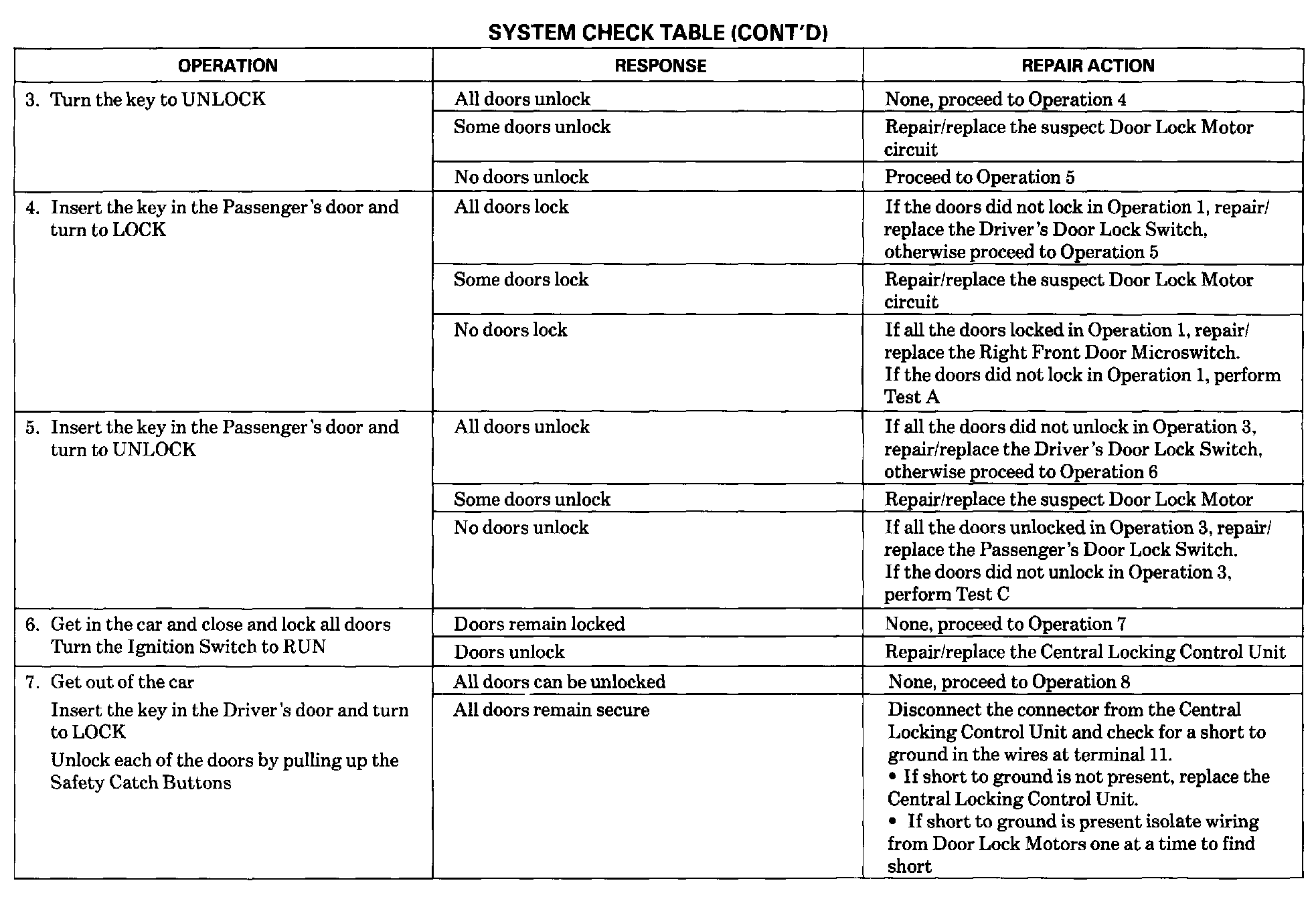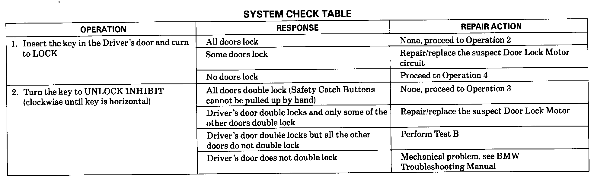 ^ Refer to Repair Action for the Response received (tests follow the System Check Table).