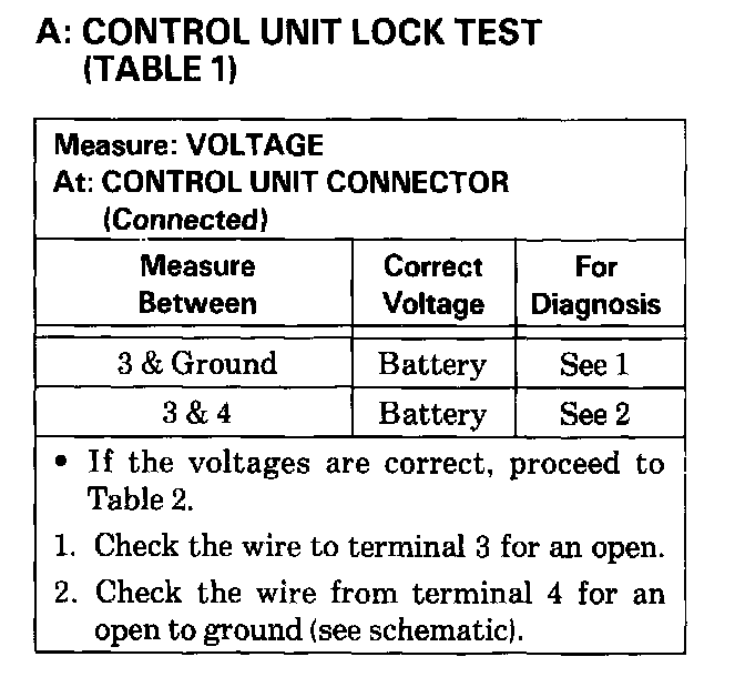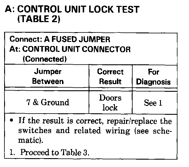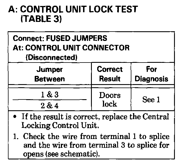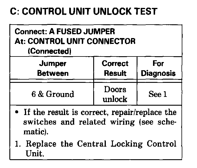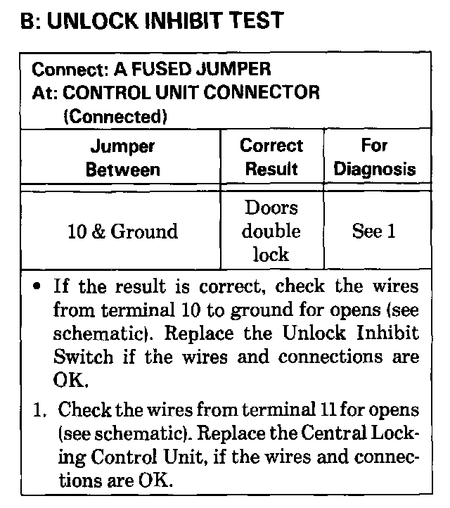 2. If all locks stay in Unlock Inhibit, check wires to terminal 10 of the Central Locking Unit for a short to ground.