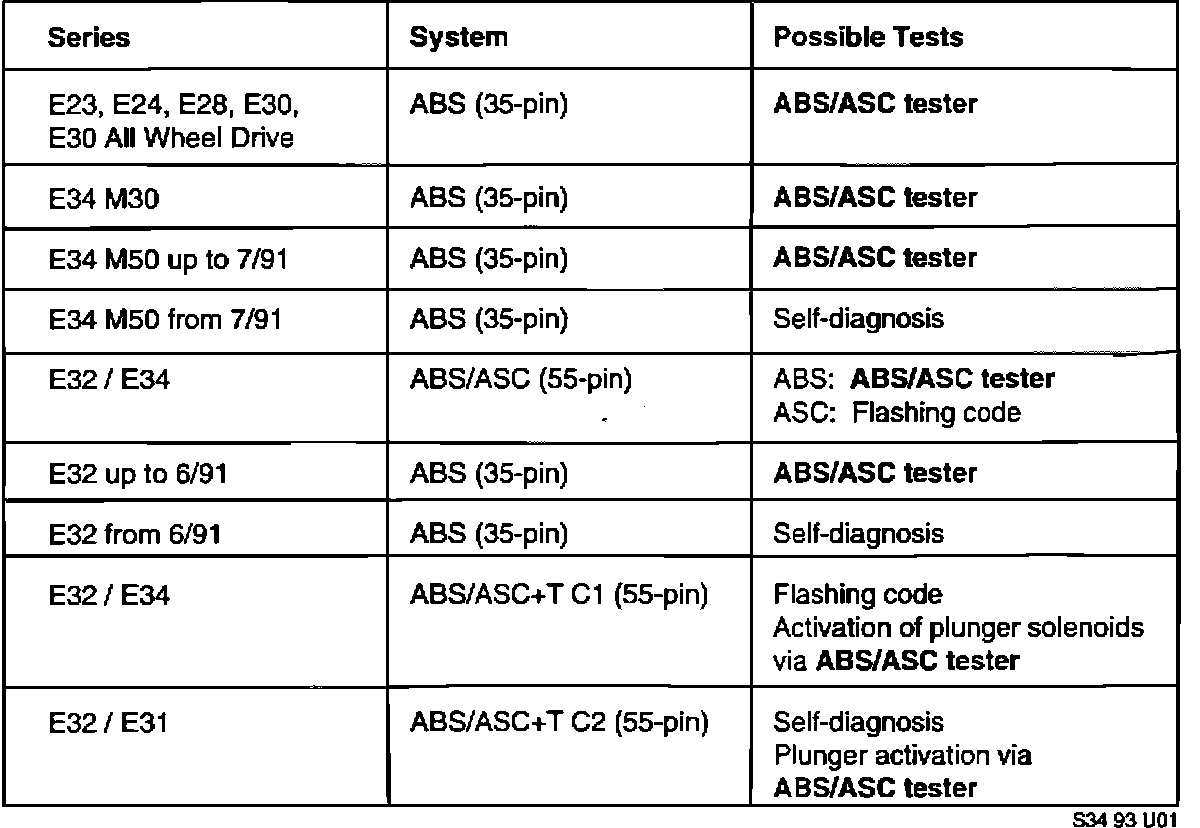 A new range of systems with diagnostic capability are being provided for slip control systems (ABS, ASC and ASC+T) which have until now only been equipped with a limited number of diagnostic functions. These systems have differing self-diagnostic capabilities; therefore, the outline summarizes these varied diagnostic functions. All information contained in current Repair Manual Microfiche and in current Diagnostic Procedures Manuals remains valid.