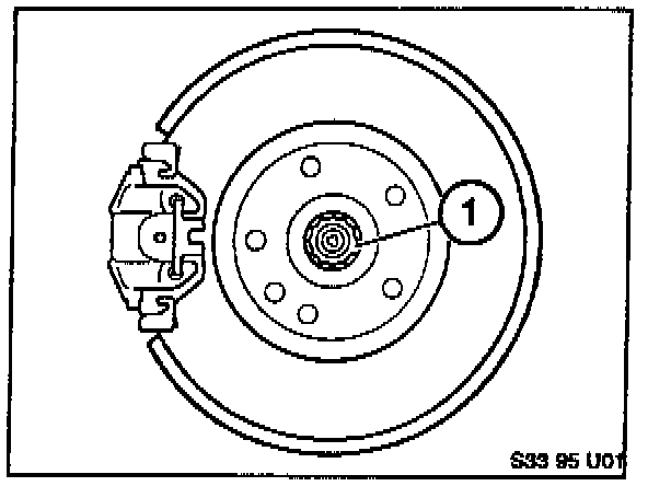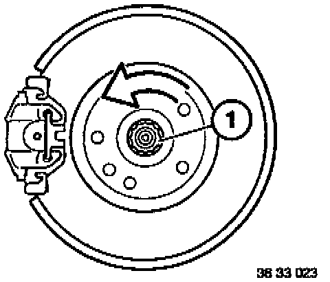 Set parking brake firmly, raise car on lift with a suitable punch, push out the staked areas on the hub nut (1) so that the nut can be rotated. Tighten the nut to 300 Nm, then loosen two turns.