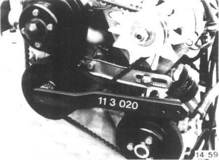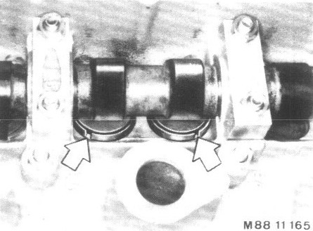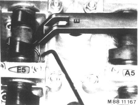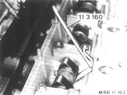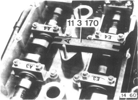 - Guide in Special Tool 11 3 170 according to camshaft "A" (exhaust) or "E" (intake) and press tappets down.