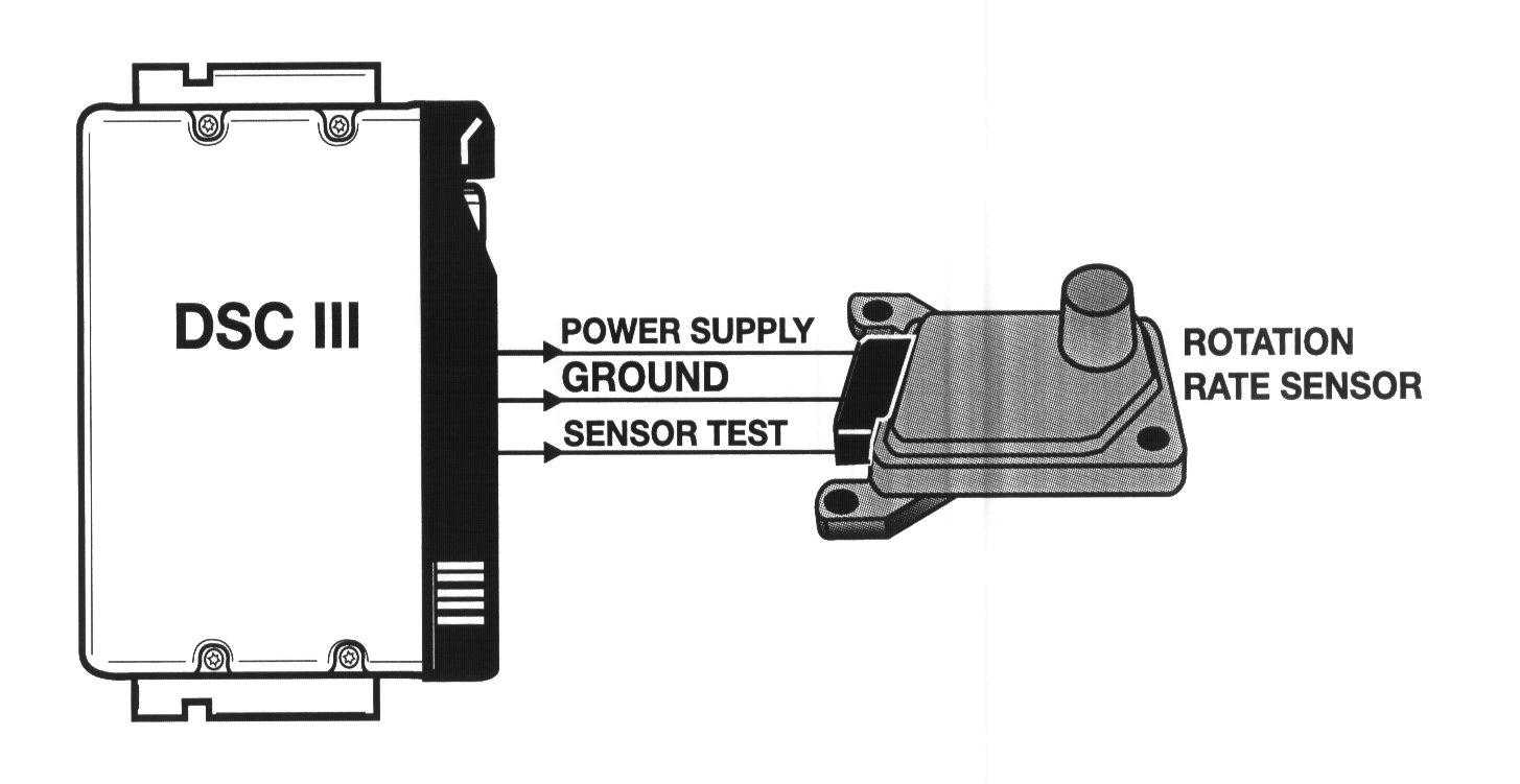 The Dynamic Stability Control (DSC) control module supplies the rotation rate sensor with 12 volts operating power and ground. Additionally the DSC continually checks the operation of the rotation rate sensor by sending a test signal over a dedicated lead. The rotation rate sensor calculates the value from the test signal and sends a signal back the DSC module. If this feedback is out of the plausibility range, the DSC will set a fault and switch the DSC control off.