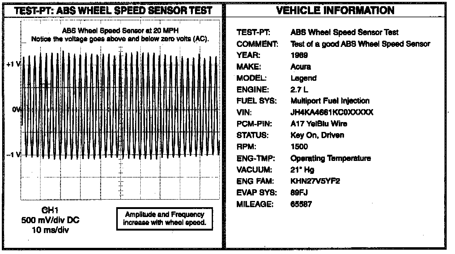 Peak voltages will vary a little from one type of sensor to the next. Also, since an integral part of the sensor is a coil, or winding, their failures can be very temperature or vibration dependent. In most of these cases the waveform will become much smaller or very deformed, and a DTC (Diagnostic Trouble Code) may set at the same time. In general, the most common ABS Wheel Speed Sensor failure by far is where the sensor won't generate a signal at all. This is not too interesting to look at, but when driving the vehicle, if the waveform stays flat, check the sensor and DSO connections, make sure the circuit isn't grounded, make sure the sensor air gap is correct, make sure the proper parts are spinning (reluctor ring present, etc.), then condemn the sensor.
