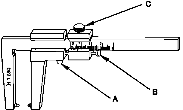 Tool # 341 280 Open the jaws of the caliper at least 10 mm wider than the thickness of the disc. Close the jaws to the work by pushing button "A", which will cause the stop "B" to pull the sliding scale to the correct reading. Lock the sliding scale in place by tightening lock knob "C". The jaws can now be opened to allow the caliper to be removed and read in the normal manner.