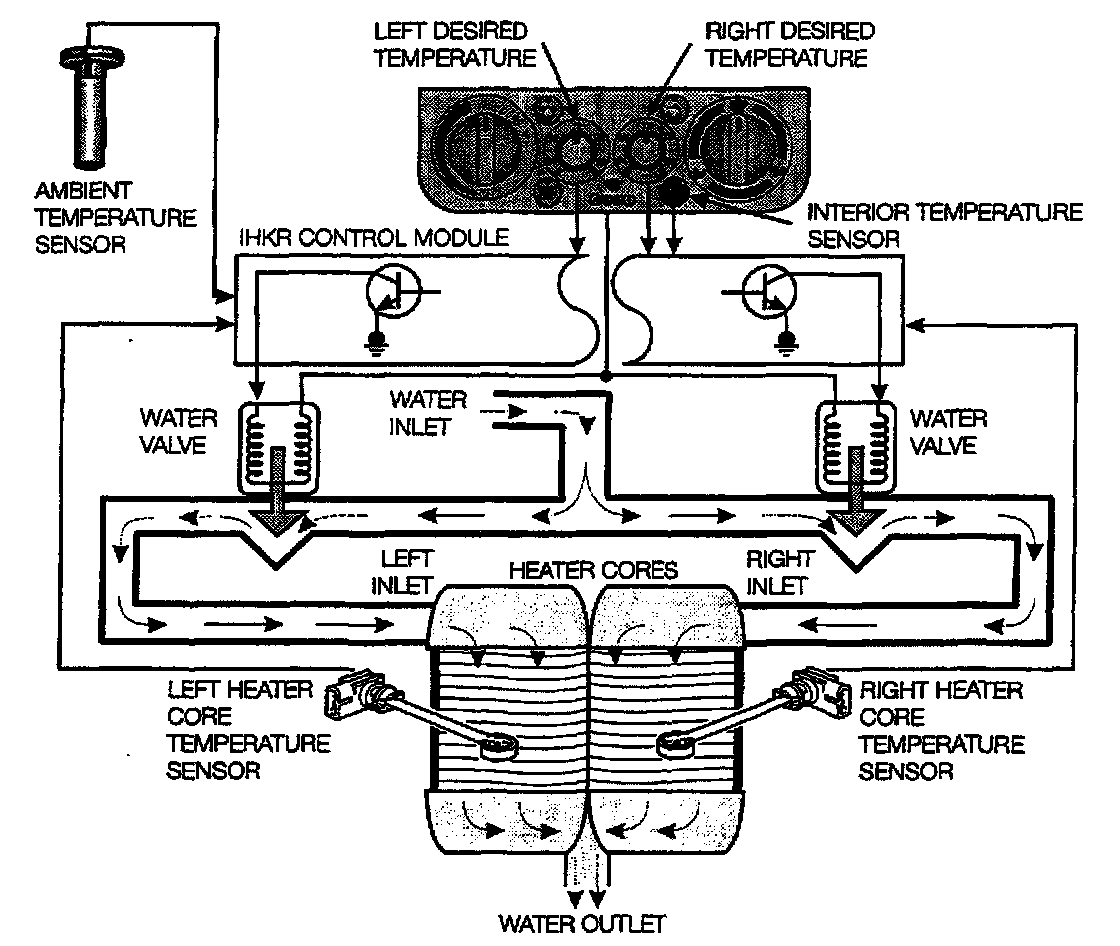A normally-open water valve is placed at the inlet to each heater core, and each valve contains a solenoid which is pulsed dosed by the IHKR E36 control module to regulate coolant flow.