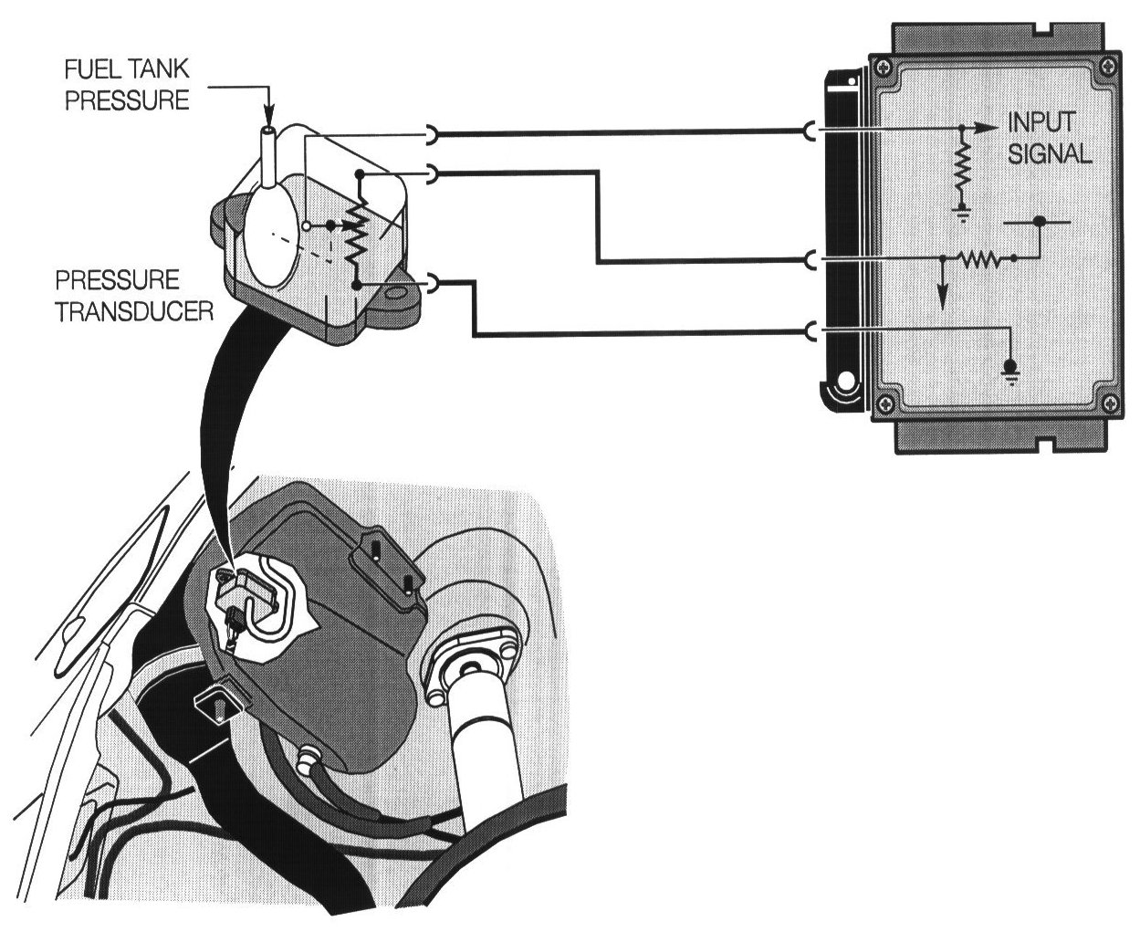 The fuel tank pressure sensor input to the ECM, is provided by the pressure transducer mounted on the liquid vapor separator. The input is used by the ECM to check the fuel storage and purge system for leaks as part of the OBD II emission requirements. The pressure sensor receives its power supply from the ECM and produces a varying voltage input to the ECM, representing the amount of pressure in the fuel tank.