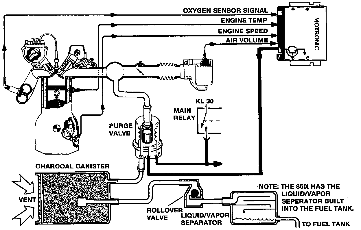 The O2 sensors detect the additional rich mixture when the DME opens the purge valves. The valves are cycled periodically during engine operation.