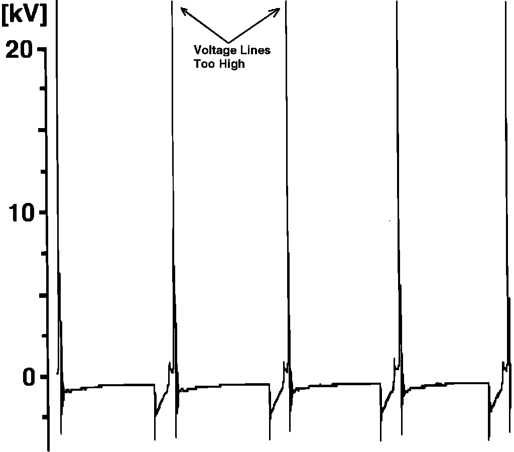 With the engine running at idle RPM, ignition voltage line height should be between (6-16 kV), and the maximum difference between cylinders should not vary by more than (3 kV). If the pattern indicates higher than normal required voltages at all ignition lines, a problem may be present with: