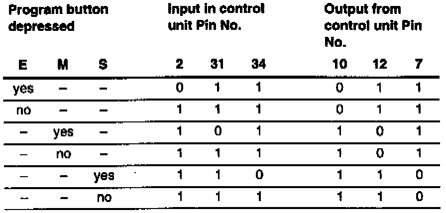 Check the program button with the aid of the universal adapter with the control unit connected and ignition switched "ON". Measure between Pin 19 (-) and the specified pins. "0" corresponds to approx. 0 V, "1" corresponds to approx. 12 V.