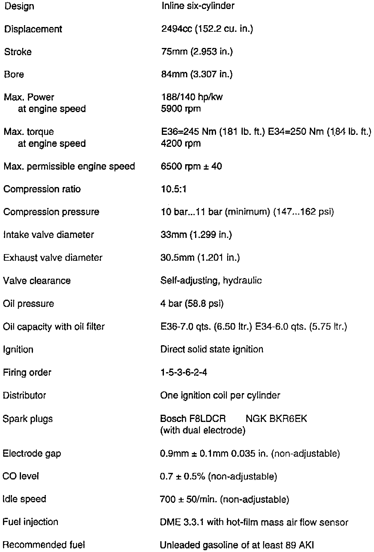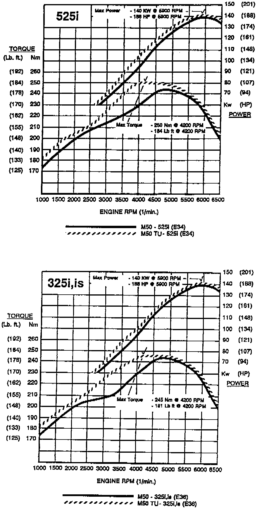 The M50 TU develops 188hp (140kw) at 5900 rpm with maximum torque outputs of 184 lb.ft. (250 Nm) at 4200 rpm (E34) and 181 lb.ft. (245 Nm) at 4200 rpm (E36). Overall internal engine friction and drag torque have been reduced by approximately 15% with the average fuel consumption being reduced by approximately 5%.