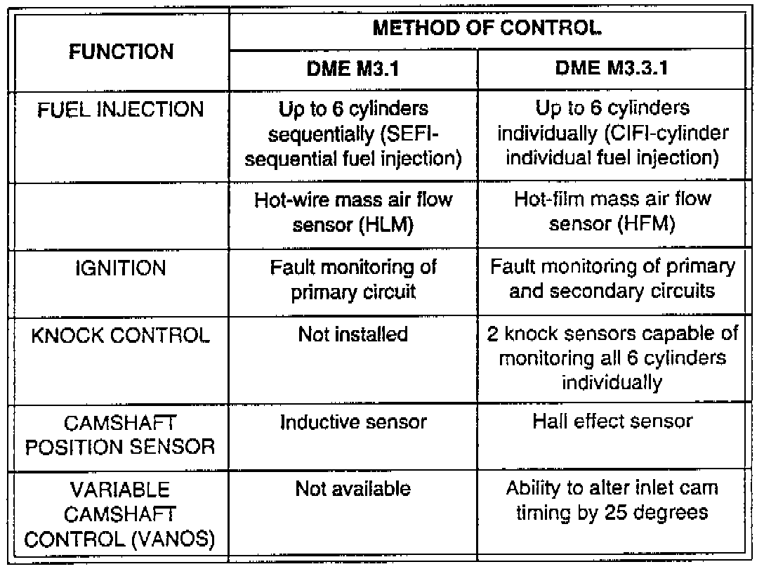 The Bosch Motronic system DME M3.3.1 used on the M50 TU is a further development of the DME M3.3 system used on the M60 engine. See TRI 11 02 92 (2124) for details on the M3.3 system. At this time the CAN (Controller Area Network) bus used on the M60 engine is not used on the DME M3.3.1 system.