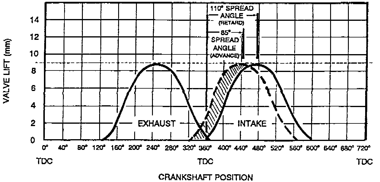 Extensive tests were carried out using various intake camshafts and timing intervals to determine the ideal valve spread angles. The spread angles used on the M50 TU are 110° in the retard position and 85° in the advanced position. The intake and exhaust valve lift is 9.0 millimeters.