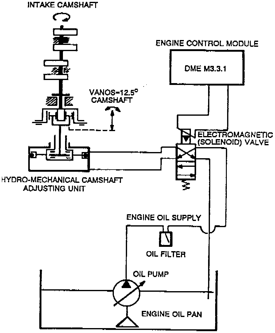One of the most important design changes introduced on the M50 TU engine is the use of the variable camshaft control system (VANOS). This system improves the engine's mid-range torque output, reduces exhaust emissions, increases throttle response, and improves idle quality by varying the intake valve timing (camshaft position) during operation. VANOS is controlled by the latest Digital Motor Electronics Management System designated DME 3.3.1, depending on engine load, speed and temperature inputs.
