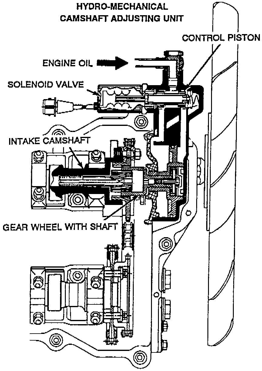 The engine control module energizes the solenoid valve which allows engine oil to flow to one of two sides of the piston in the Hydro-mechanical camshaft adjusting unit. The engine oil pressure moves and holds the piston at one of its two mechanical stops. A gear wheel with a shaft rotates inside the hydraulic piston. It converts the piston stroke by way of helical-cut teeth into rotary movement of the camshaft which is relative to the driven sprocket.