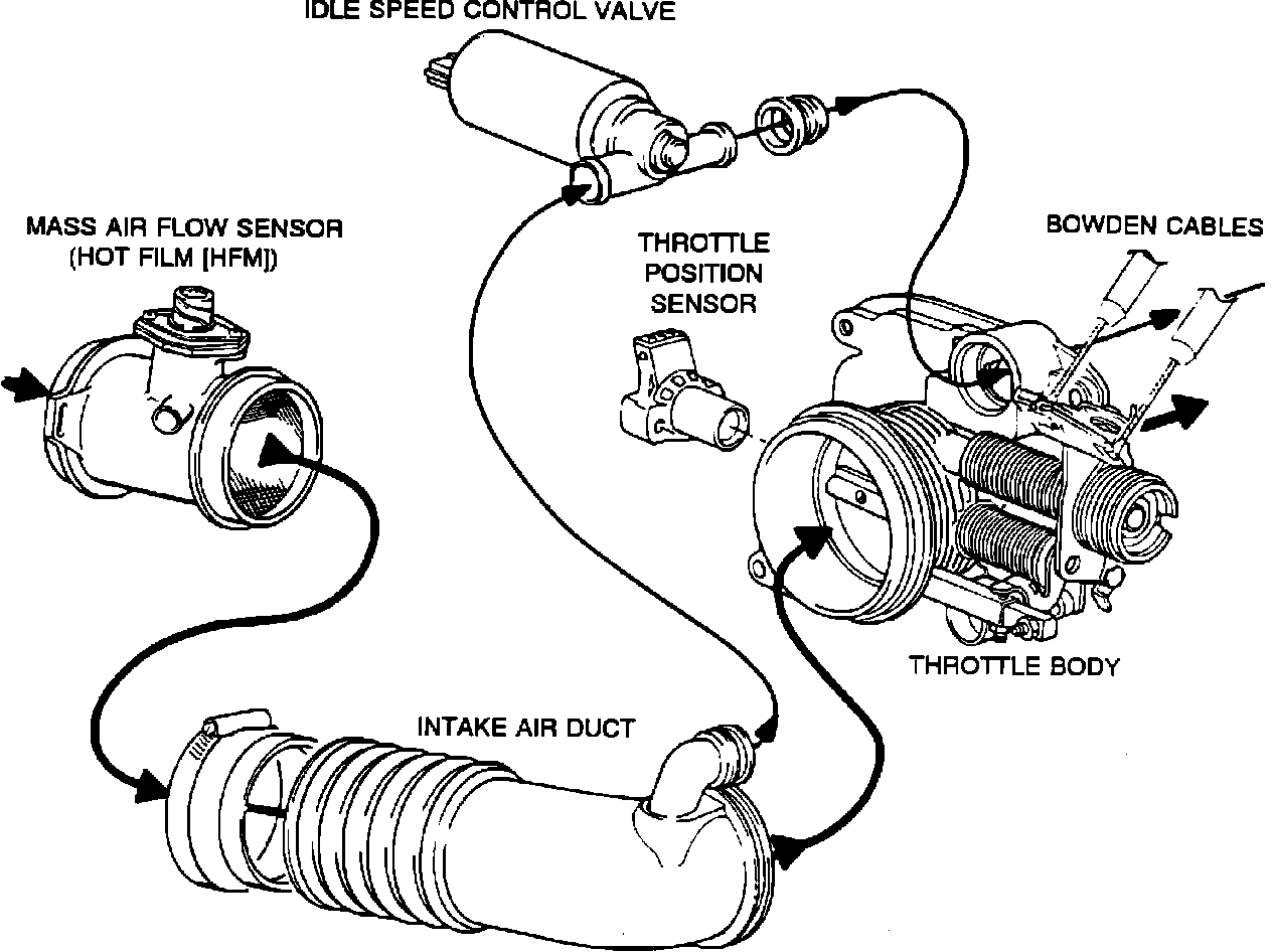 The air mass meter is located in the induction system between the air cleaner and the intake manifold.