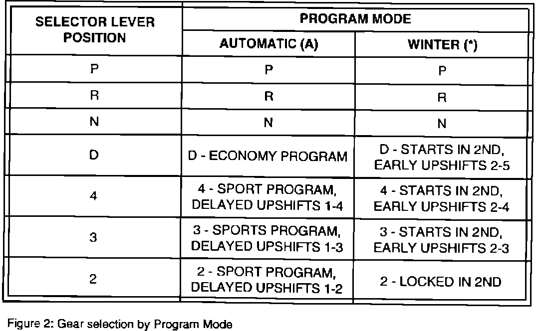 A console mounted tip switch allows the driver to select either the Automatic or Winter mode. The Winter mode is designated by an ice crystal symbol (*) on the program switch. In the Winter mode, the transmission starts off in 2nd gear and the upshifts are programmed to occur earlier to reduce the torque at the drive wheels and prevent wheel spin. The chart explains the gear selection in each drive program based on the selector lever position.