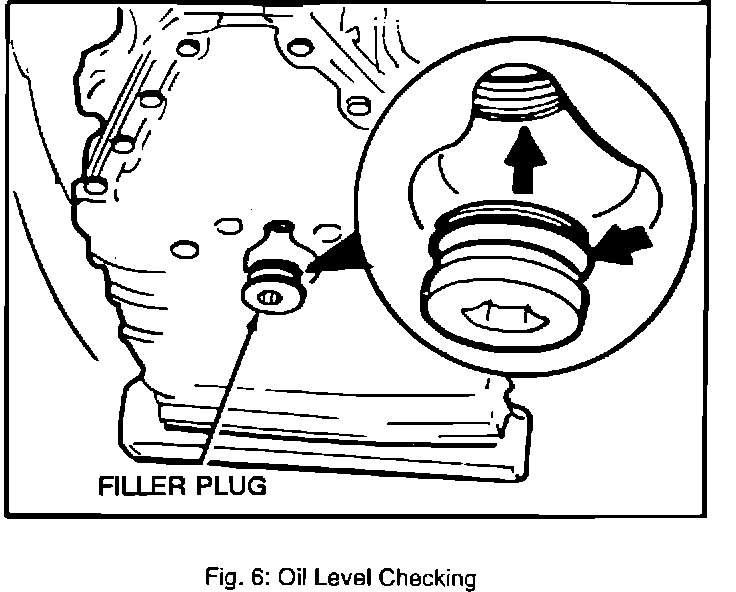 - With the engine running and the selector lever in PARK or NEUTRAL position, remove the filler plug located in the bottom of the oil sump and add the specified oil if necessary until it starts to overflow.