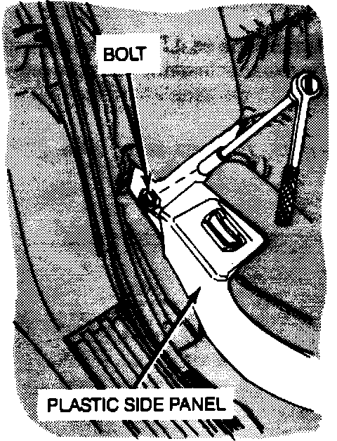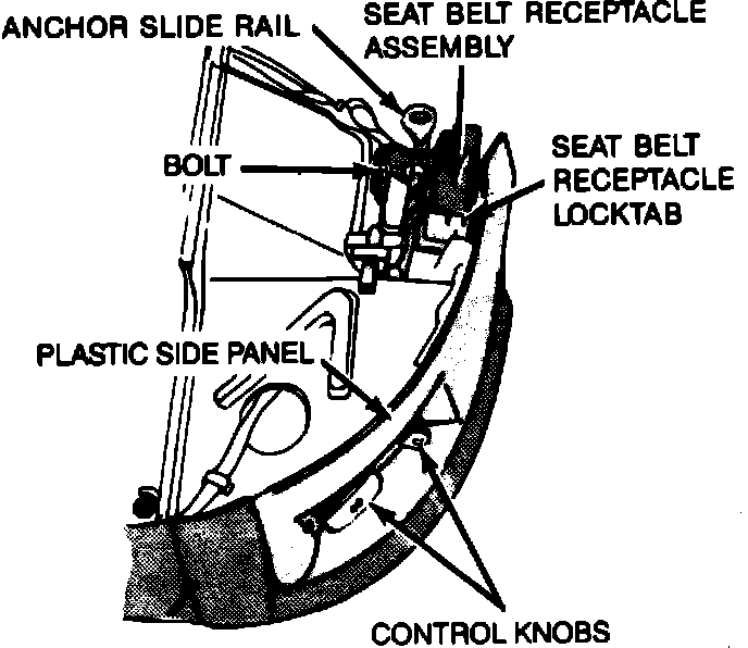 8. Replace the bolt holding the seat belt receptacle to the seat cushion, and replace the plastic side panel and control knobs.