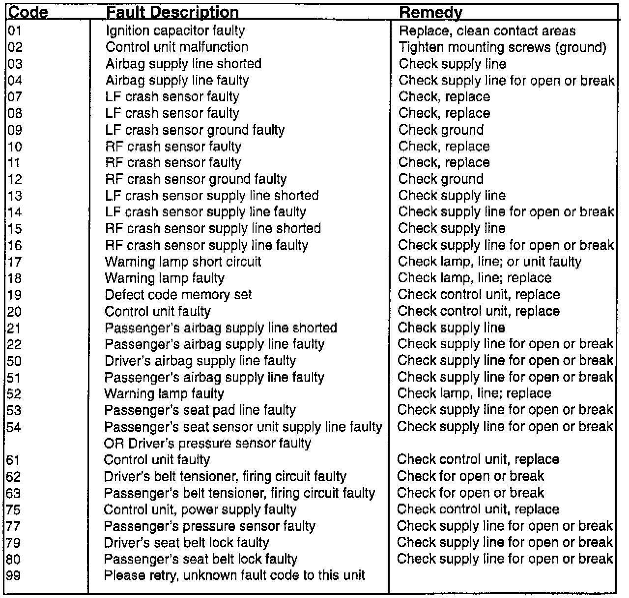 Provided here is a description and remedy for the two digit numeric trouble codes.