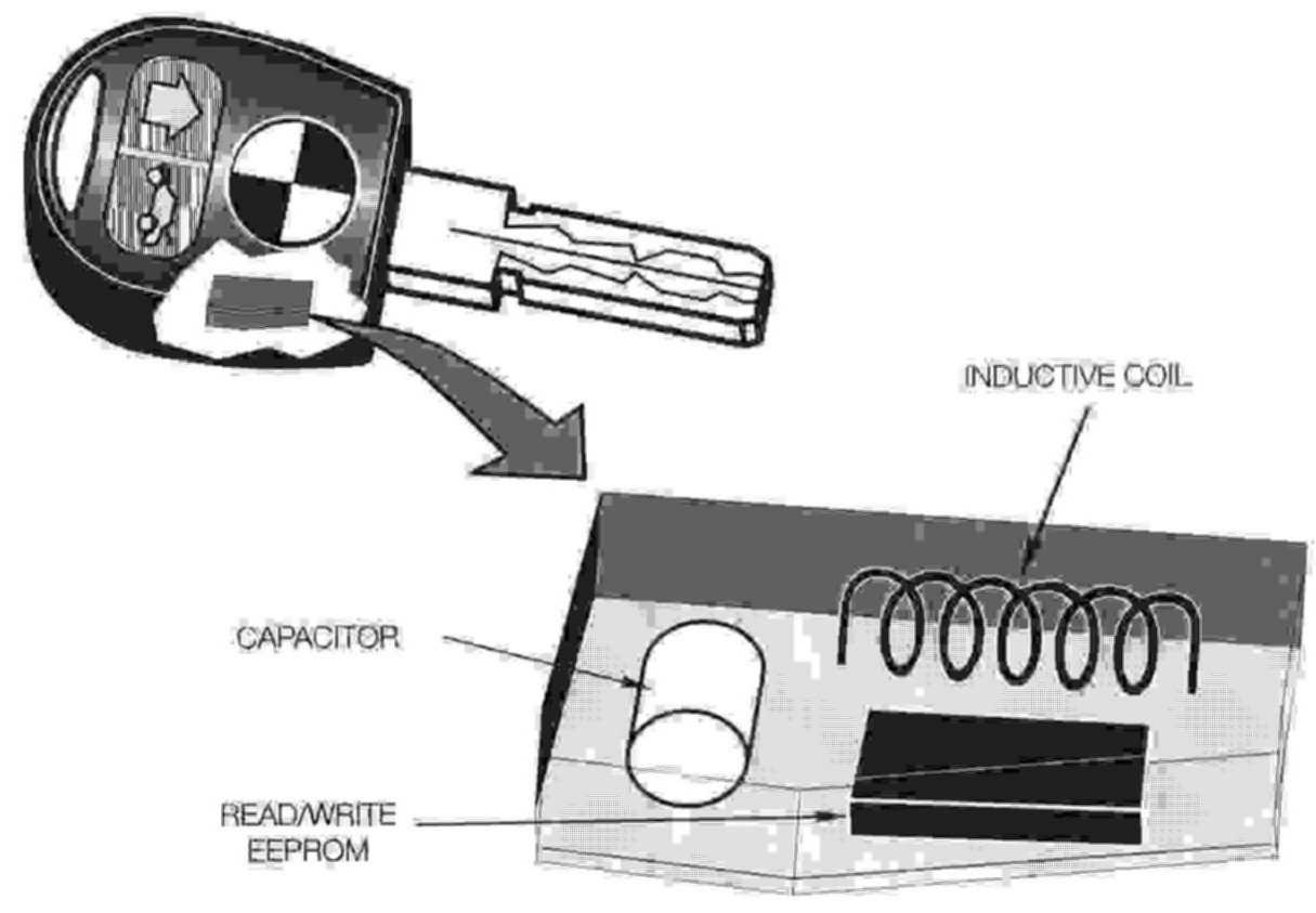 The function of the transponder is to receive and transmit data to and from the EWS II control module. The transponder chip contains a wireless read/write EEPROM as well as a small capacitor and coil for its power supply.