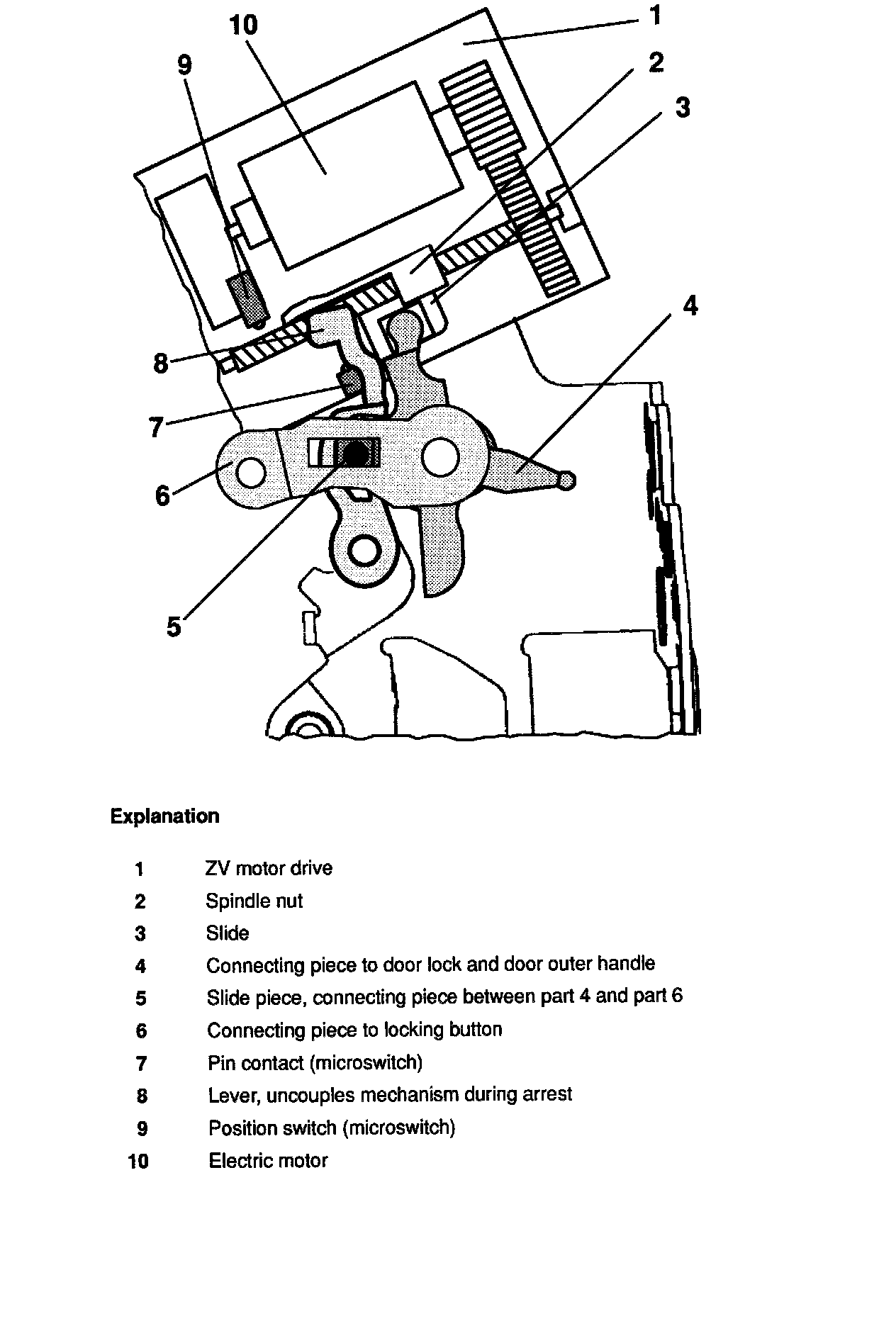 A microswitch is operated by the driver's door lock when it is turned to the "arrest" position. The ZV module powers the electric motors "10" in the ZV motor drives "1". The spindle nut "2" is moved. It uncouples from the slide blocks "3" and moves the lever "8". This lever uncouples the locking button from the "unlocking mechanism" in the turn-catch lock.