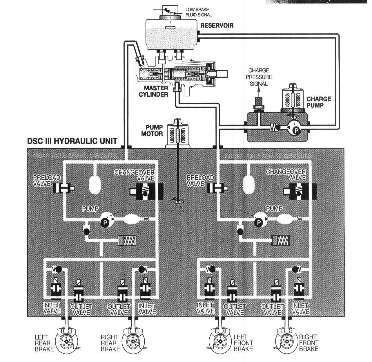 Master cylinder, fluid reservoir and level switch. All to ensure sufficient brake fluid supply is always available to the hydraulic unit during ASC/DSC hydraulic regulation, the system requires an additional pumping system not equipped on any previous ASC+T system.